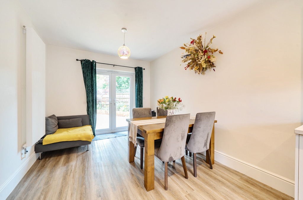 The kitchen includes both low level and high level units, one and a half bowl stainless steel sink with mixer tap, worksurface with upstands, tiling to splashback areas, space for a dining table, feature vertical radiator, continued wood effect flooring and integrated appliances such as an eye-level double oven, fridge/freezer, dishwasher and washing machine. It’s a dual aspect space with a glazed window to the front aspect and glazed French doors to the rear aspect.