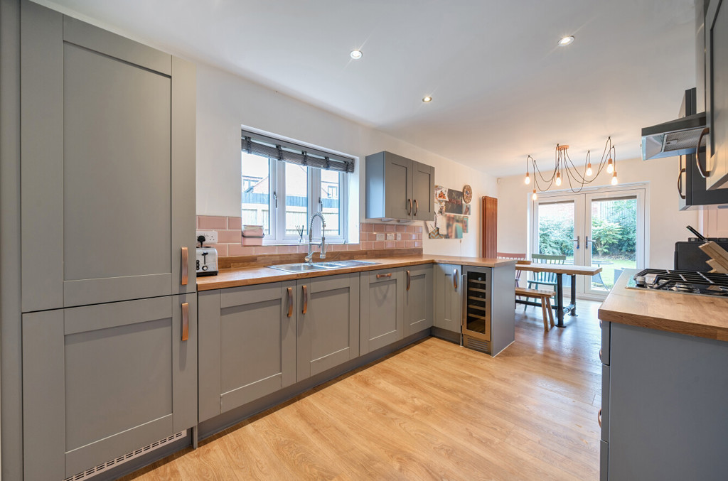 The dining/family room has space for a dining table, space for seating, feature vertical radiator, continued wood effect flooring and a door leading to the entrance hall. To the rear aspect is a glazed window and glazed French doors which lead out to the garden.