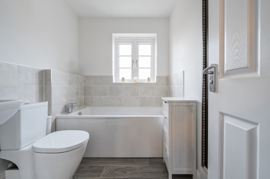 Ensuite two is a Jack-and-Jill arrangement with doors leading to bedrooms two and three. It includes a WC, handwash basin, shower cubicle, wall tiling, chrome towel radiator, obscured glazed window to the side aspect and an extractor fan.