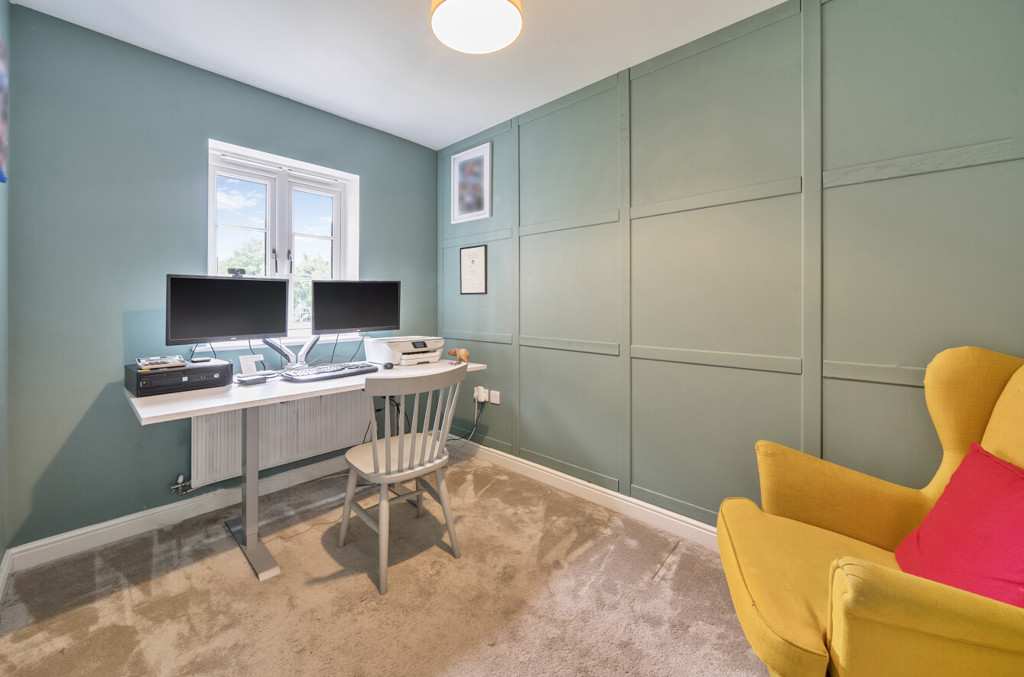 The office includes carpeted flooring and a glazed window to the front aspect.
