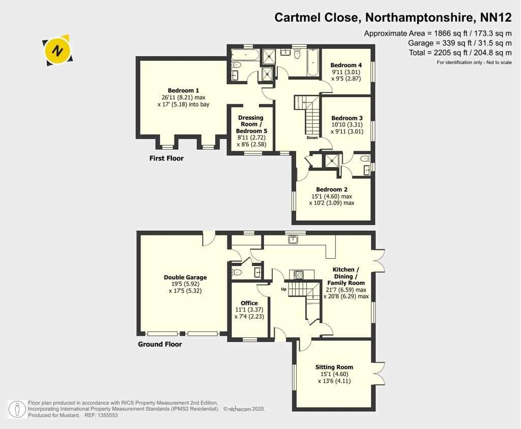 Bedroom one includes carpeted flooring, partially vaulted ceiling, two glazed dormer windows to the front aspect, air conditioning, and doors leading to the ensuite and to the dressing room/bedroom five.