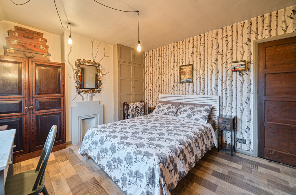 Bedroom one includes wood effect flooring, feature vertical radiator, feature fireplace and a glazed window to the rear aspect with rural views.