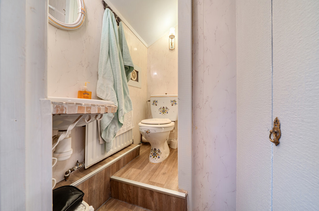 The kitchen includes both high level and low level units, exposed original beams, tiled flooring, ceramic sink with mixer tap, tiling to splashback areas and spaces for appliances such as a range-style cooker, fridge/freezer, dishwasher and washing machine. There’s a glazed window to the side aspect and to the rear aspect are two glazed windows and partially glazed French doors which lead out to the garden.
