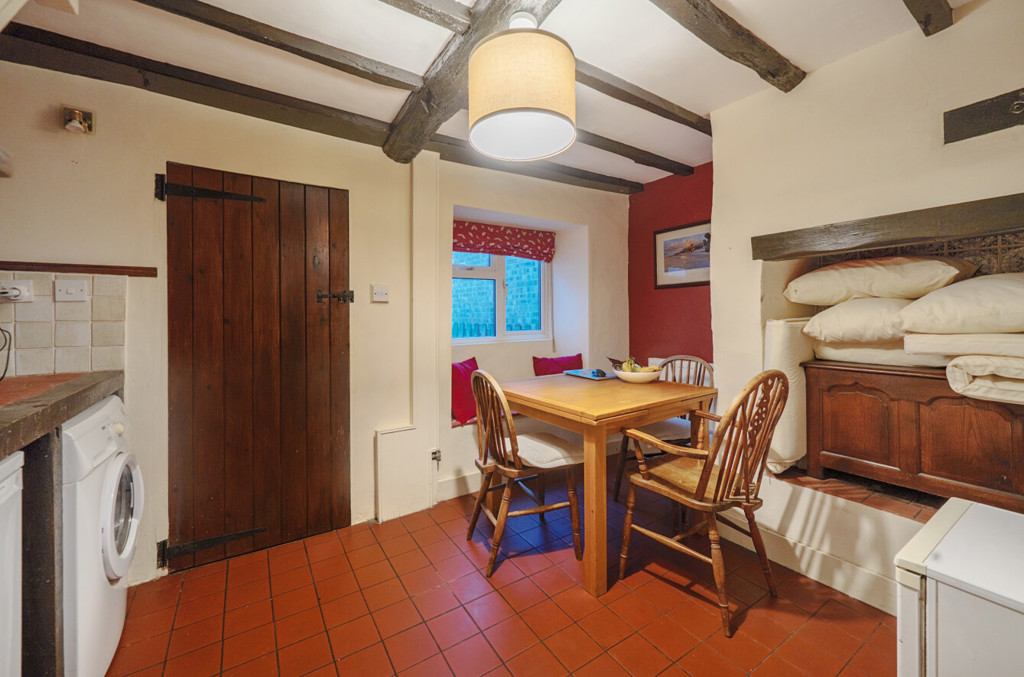 The dining room includes terracotta tiled flooring, space for a dining table, built in storage, feature fireplace with wooden mantel, exposed original beams, door leading through to the kitchen and a box bay window to the rear aspect with a seating area. There’s also a worksurface area with tiling to splashback areas and spaces for appliances beneath.