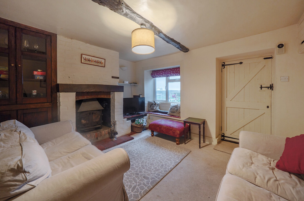The sitting room includes a bay window to the front aspect with a seating area, an exposed original beam, feature fireplace with multi-fuel stove and wooden mantel, carpeted flooring, built-in storage dresser, stairs rising to the first floor landing and an opening through to the dining room.
