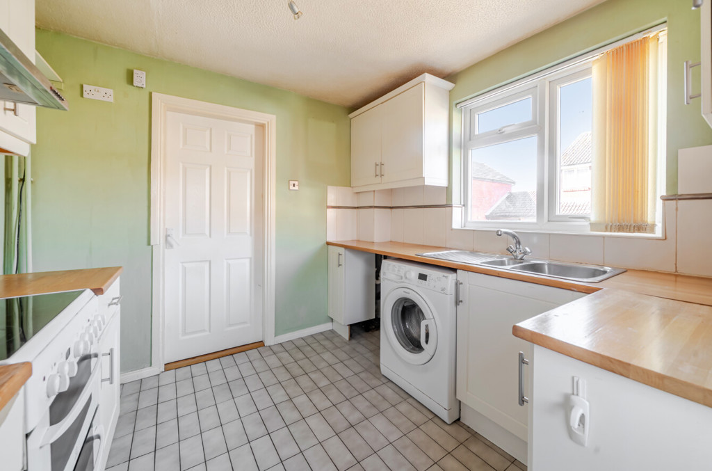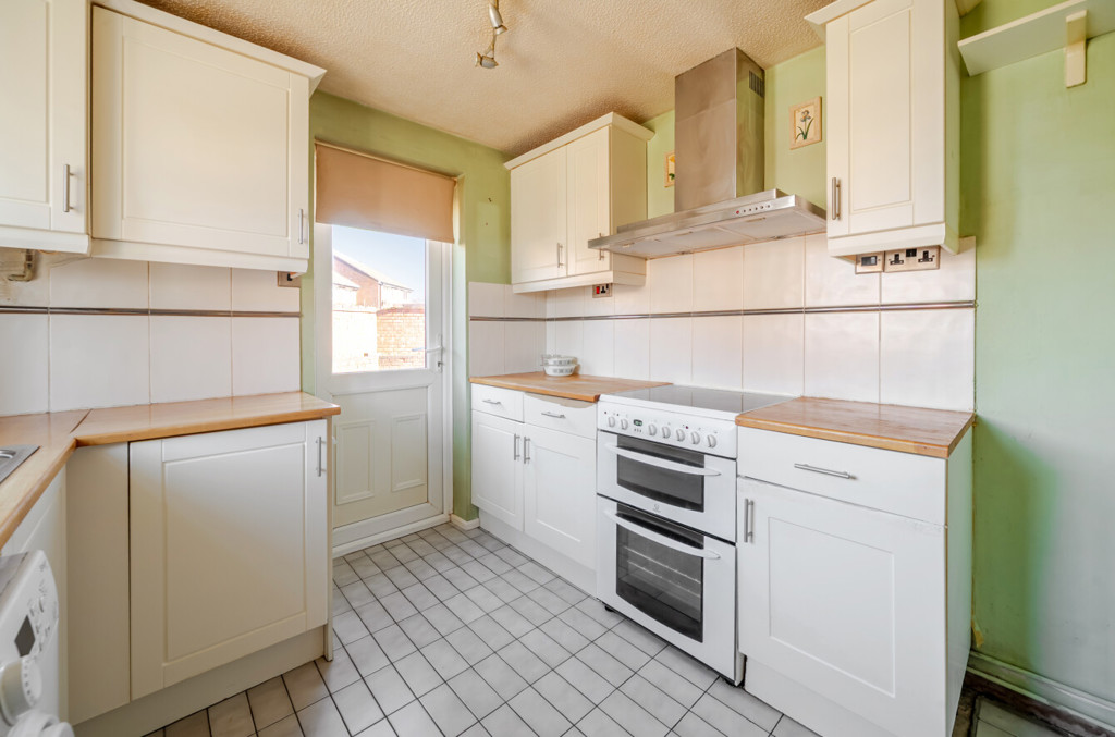 The kitchen includes both high level and low level units, stainless steel sink with mixer tap, tiling to splashback areas, tiled flooring and an integrated extractor hood. There are also spaces for further appliances such as a cooker, washing machine and fridge/freezer. To the front aspect is a window and to the side aspect is a partially glazed door which provides external access.