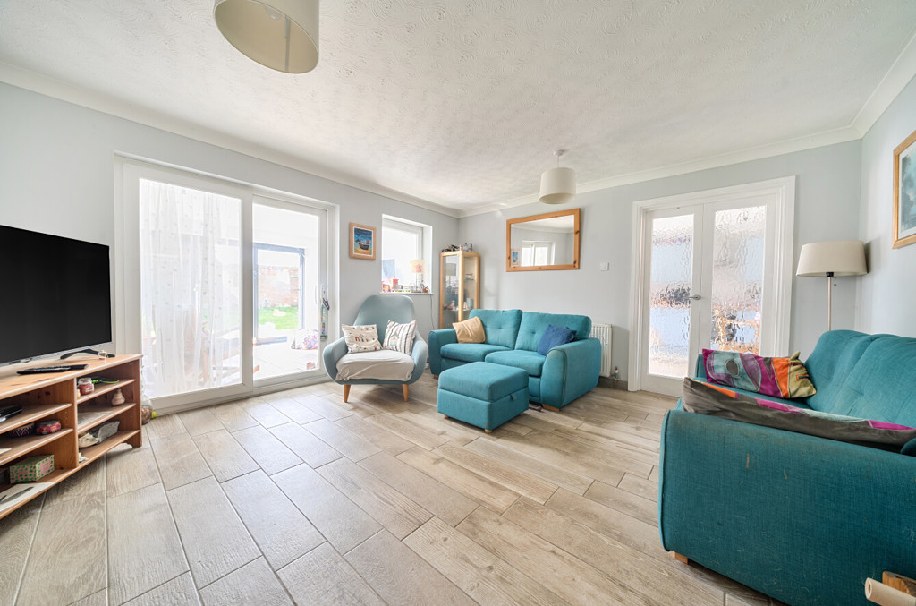 The sitting room includes tiled flooring, glazed French doors leading into the kitchen and to the rear aspect is an internal window and glazed patio doors which lead into the family room.