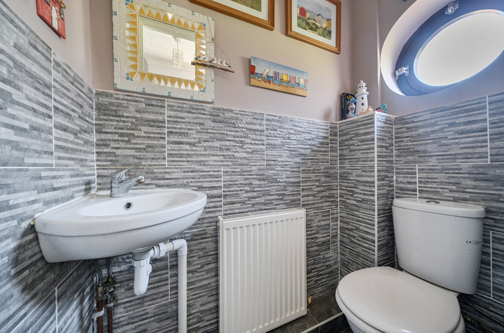 The cloakroom includes a WC, handwash basin, half height wall tiling and a port hole window to the front aspect.