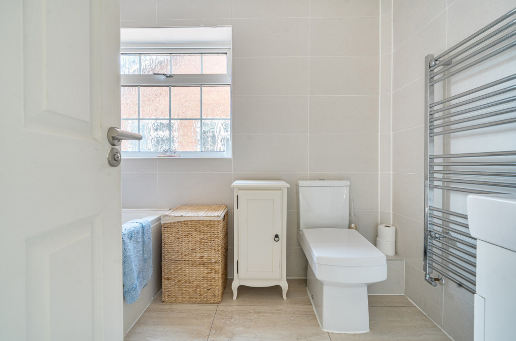 The bathroom includes a WC, handwash basin, panelled bath, with shower over, chrome towel radiator, wall tiling, obscured glazed window to the side aspect and an extractor fan.