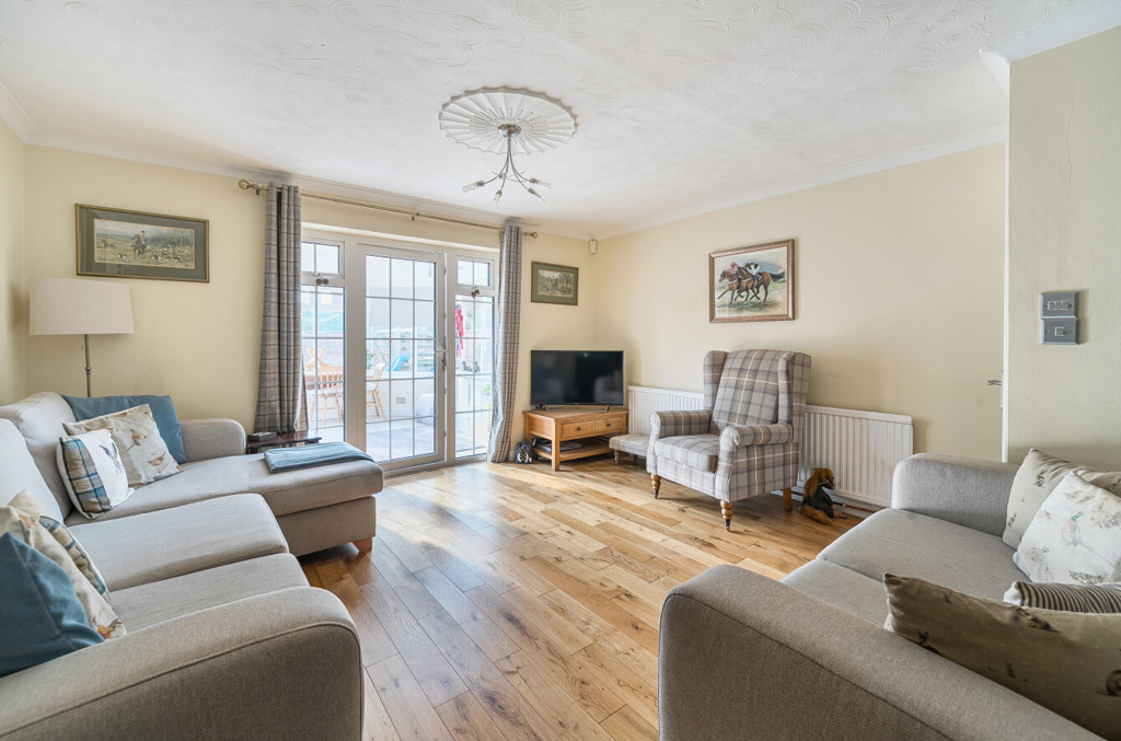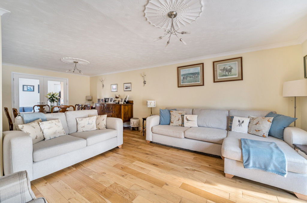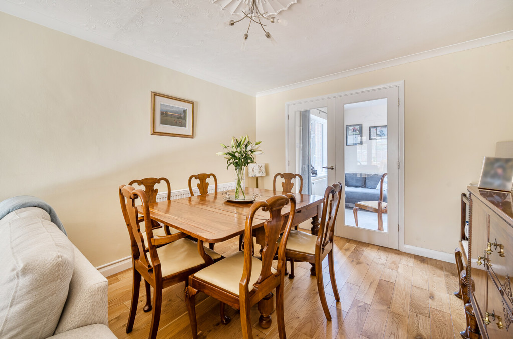 The sitting/dining room includes wood flooring running throughout, double doors leading to the office and the conservatory.