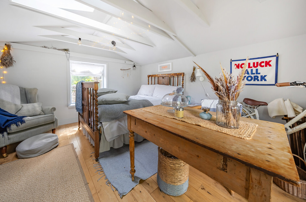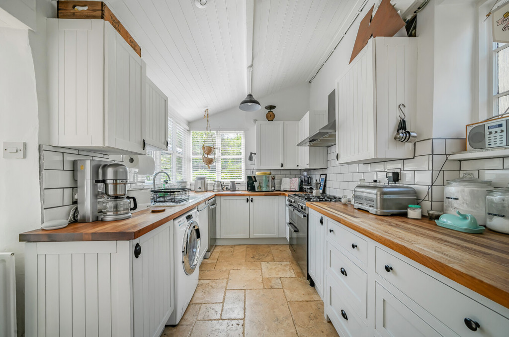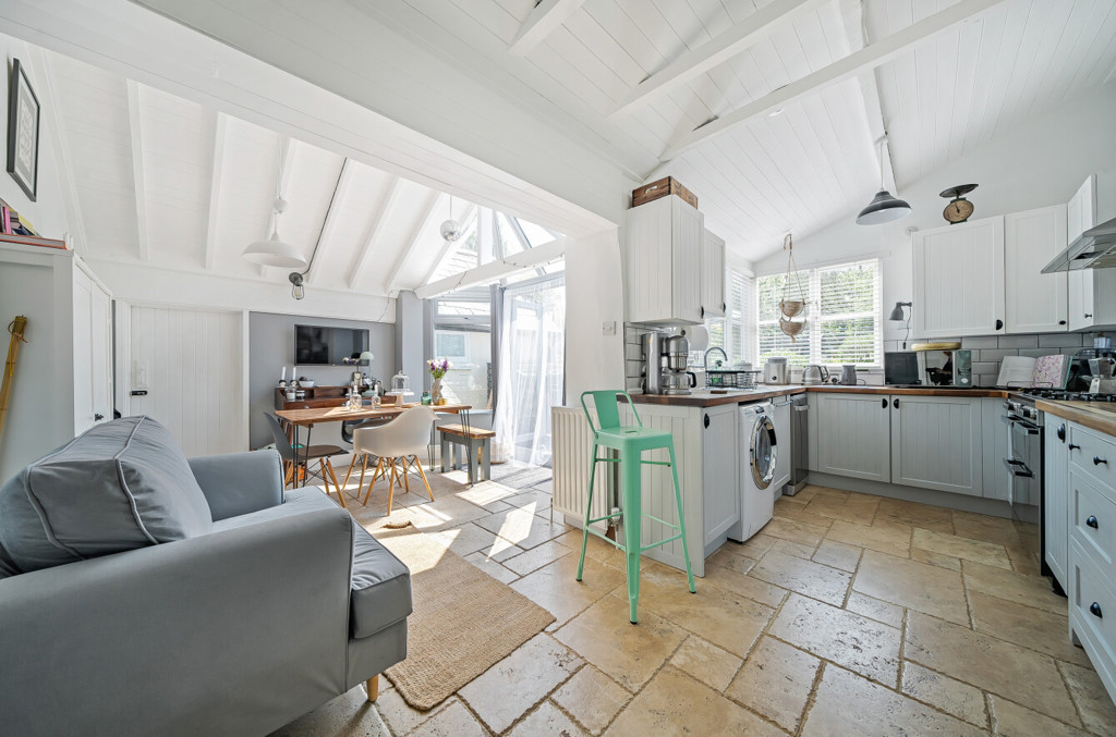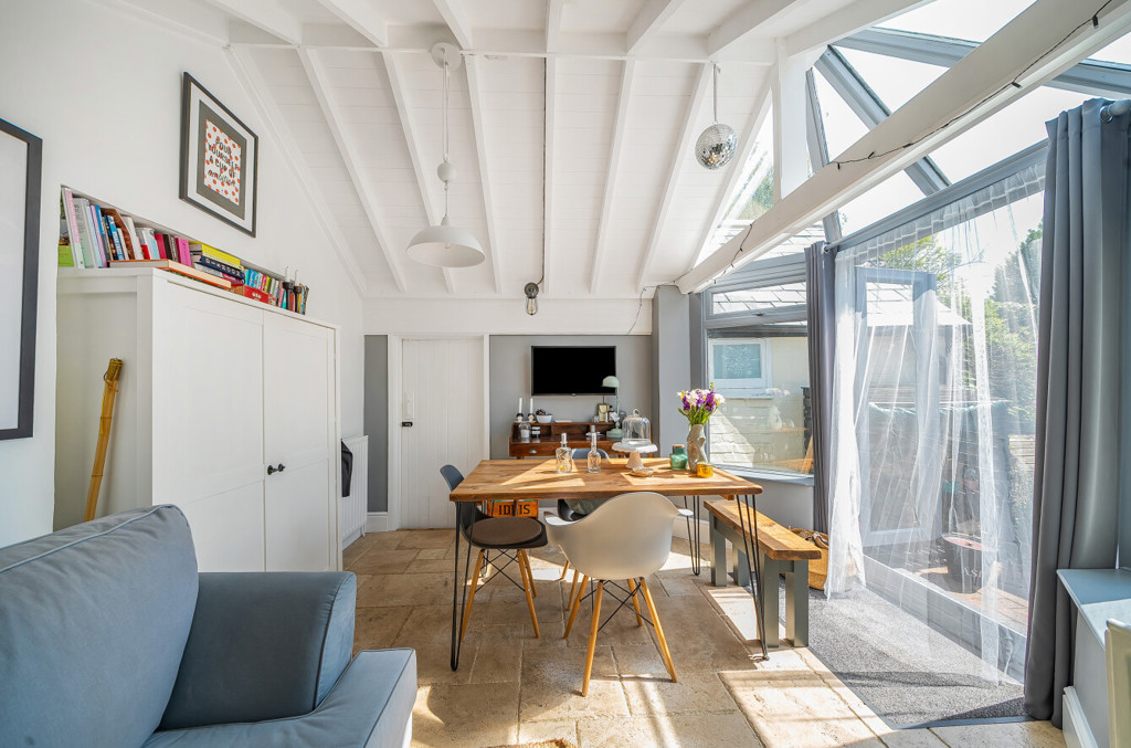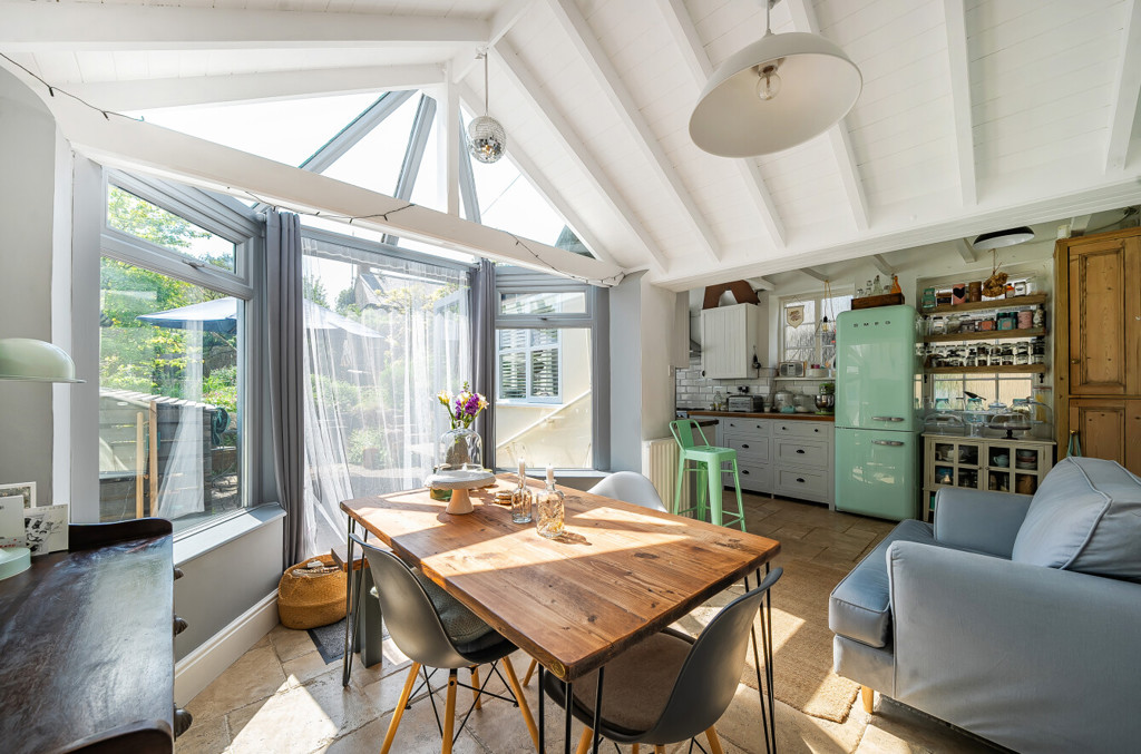 The kitchen has a pitched ceiling and includes both low level and high level units, solid wooden worksurfaces, ceramic sink with swan neck mixer tap, splashback tiling, integrated extractor hood and glazed windows to the rear and both side aspects. There’re also spaces for additional appliances such as a RangeMaster cooker, washing machine, dishwasher and fridge/freezer. The kitchen shares an open plan space with the dining room which has a part vaulted part atrium-style ceiling, space for a dining table, continuous floor tiling running throughout and a door leading to a lobby. To the rear aspect are further glazed windows and glazed French doors which lead out to the garden.