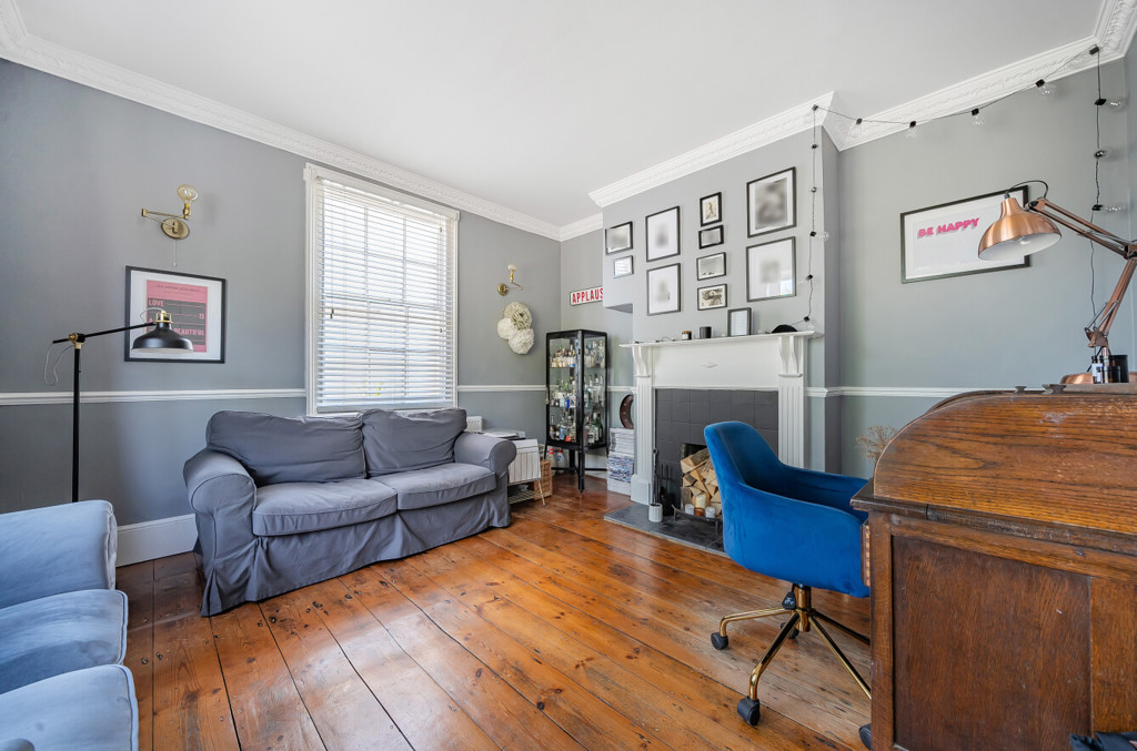 The sitting room includes solid wooden flooring, wall lighting, feature fireplace, glazed sash window to the side aspect and a bay to the front aspect which is the former shop front window.