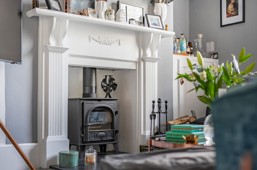 The family room includes carpeted flooring, coving to the ceiling, built in storage cupboards, an original cast iron bread oven, door leading to the basement and a fireplace containing a cast iron log burning stove with granite hearth. There are glazed windows to both side aspects.