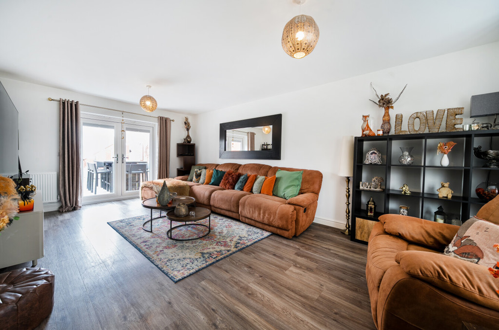 Glazed French doors lead into the Family room which includes continued Karndean wood effect flooring and a glazed window to the front aspect.