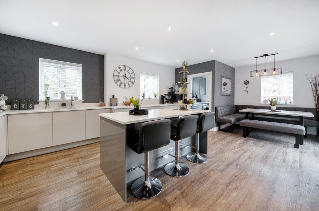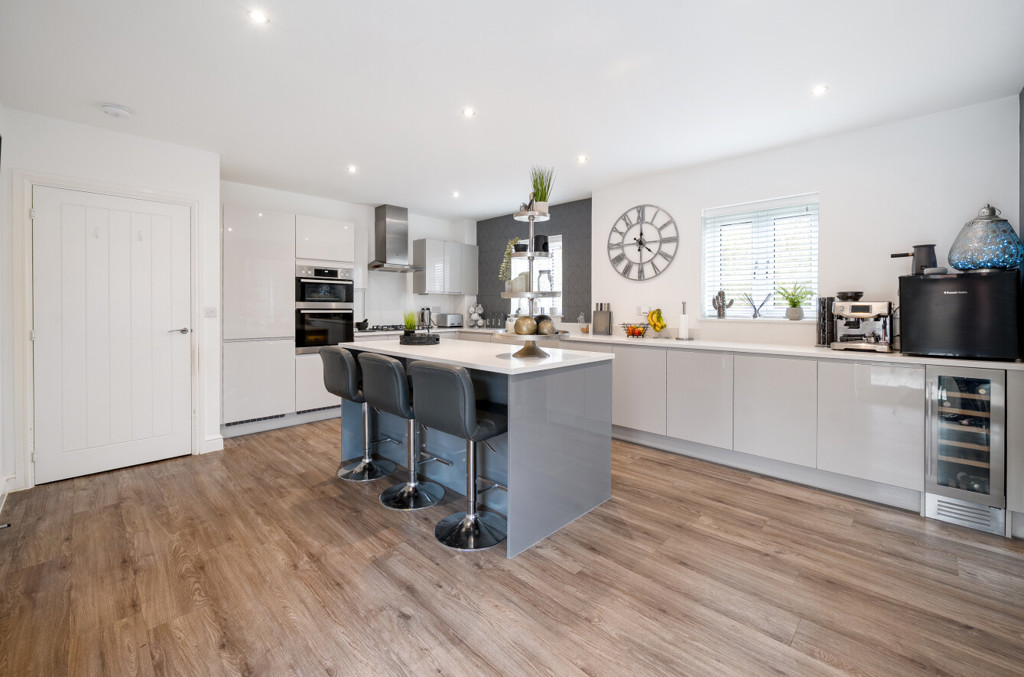 The kitchen includes both low level and high level units, quartz worksurfaces with upstands, under-unit lighting, inset sink with mixer tap and drainage grooves, central island with space for seating, space for a dining table, spotlighting, continued Karndean wood effect flooring, door leading to the utility room and integrated appliances such as an eye-level double oven, hob with quartz splashback, extractor hood, dishwasher, wine fridge and fridge freezer. There and glazed windows to the side and rear aspect and to the other side aspect are glazed French doors which lead out to the garden.