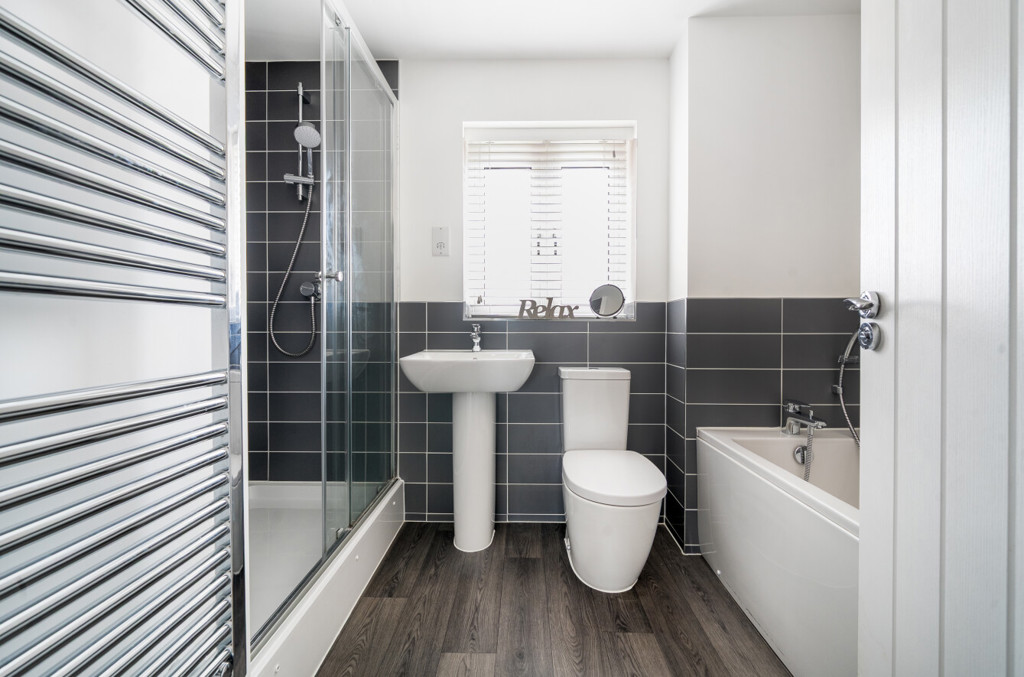 The bathroom includes a WC, handwash basin, panelled bath with shower attachment, double shower cubicle, chrome towel radiator, spotlighting, shaver point, wall tiling and an obscured glazed window to the rear aspect.