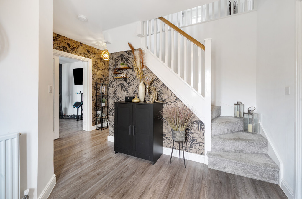 Enter via the front door into the entrance hall which includes Karndean wood effect flooring, stairs rising to the first floor landing and doors leading to all ground floor accommodation and to a storage cupboard.