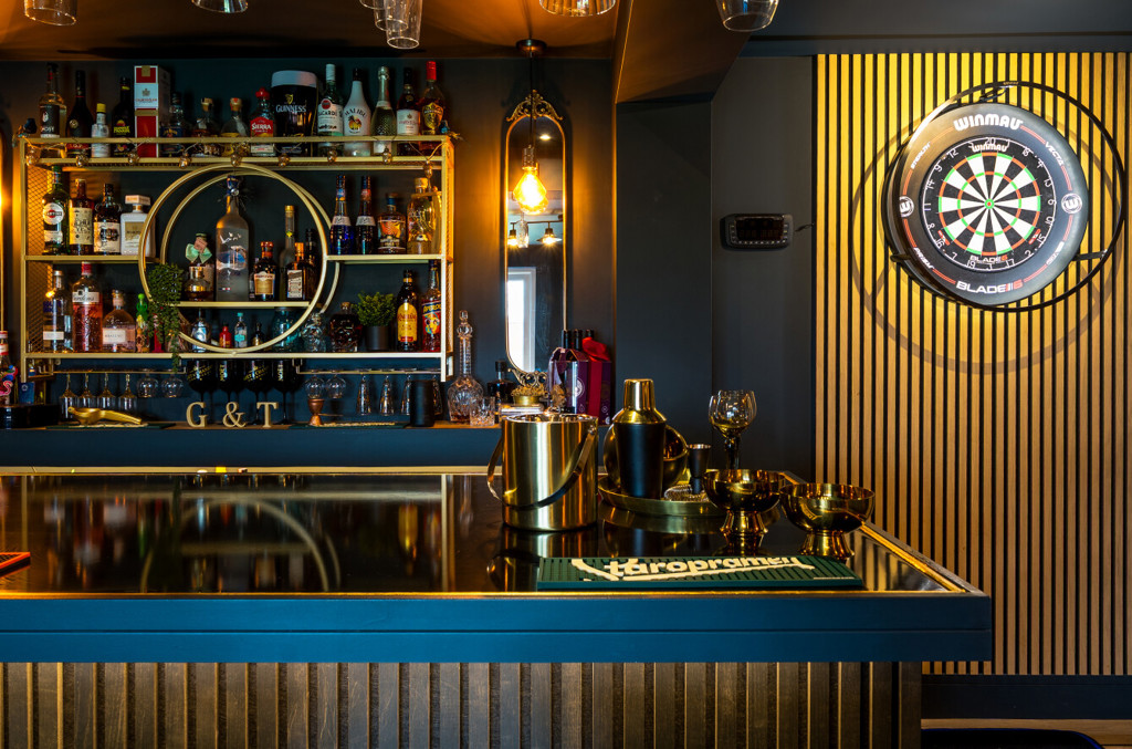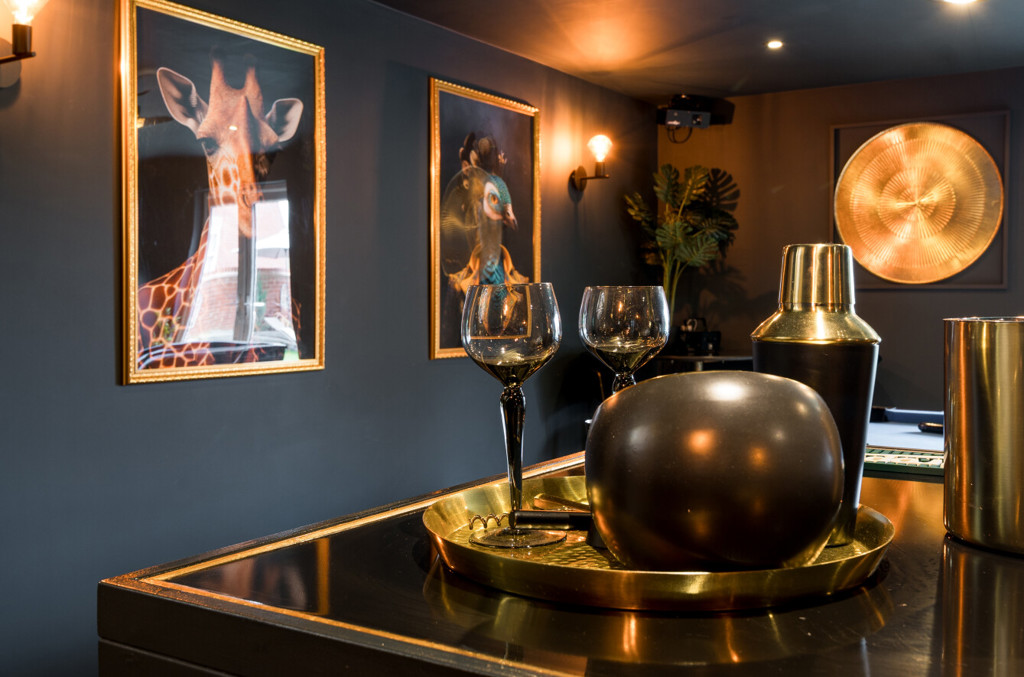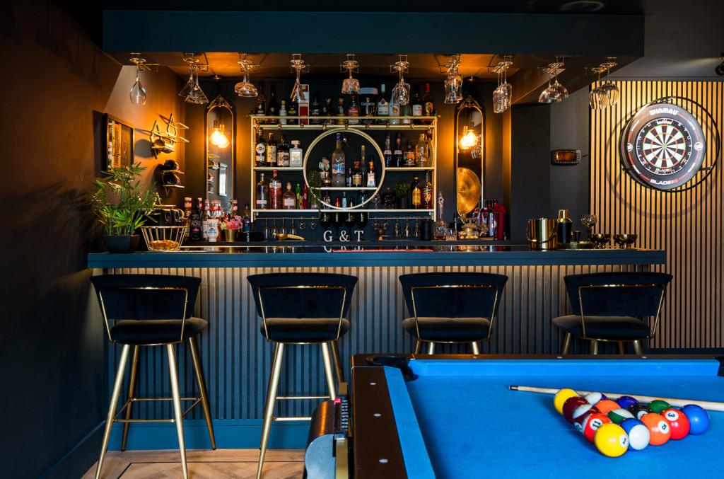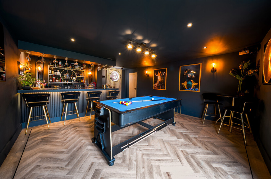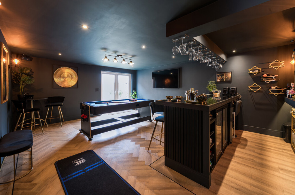 The garage has been converted into a bar/games room and includes a bar area with space for seating, spotlighting, door leading into a storage area, herringbone flooring, space for an under counter fridge and glazed French doors leading into the garden.