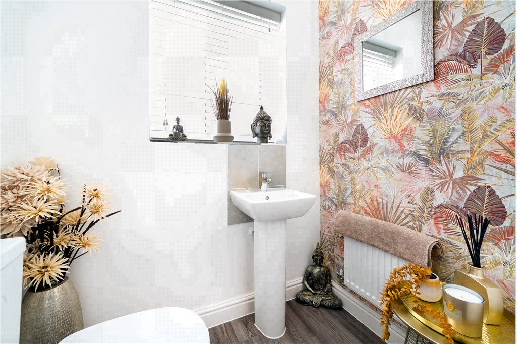 The cloakroom includes a WC, handwash basin with tiled splashback, spotlighting, obscured glazed window to the front aspect and an extractor fan.