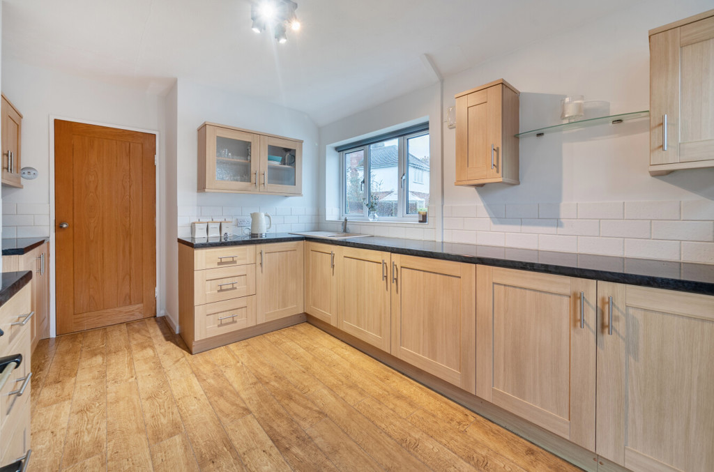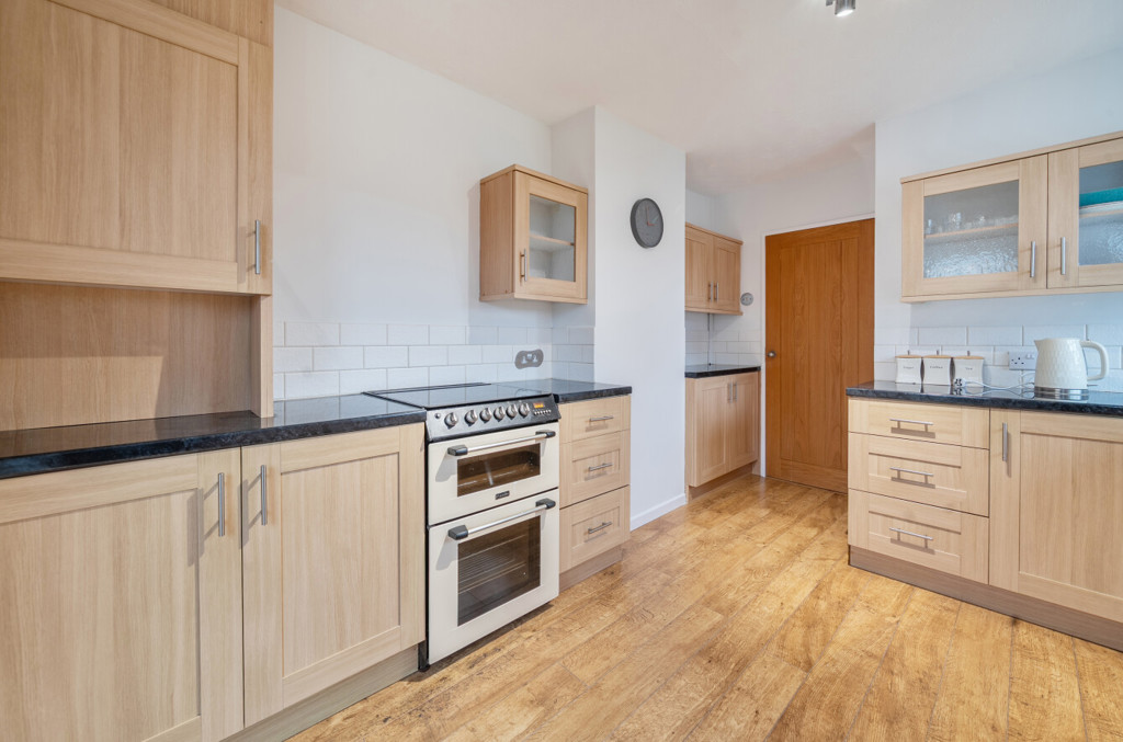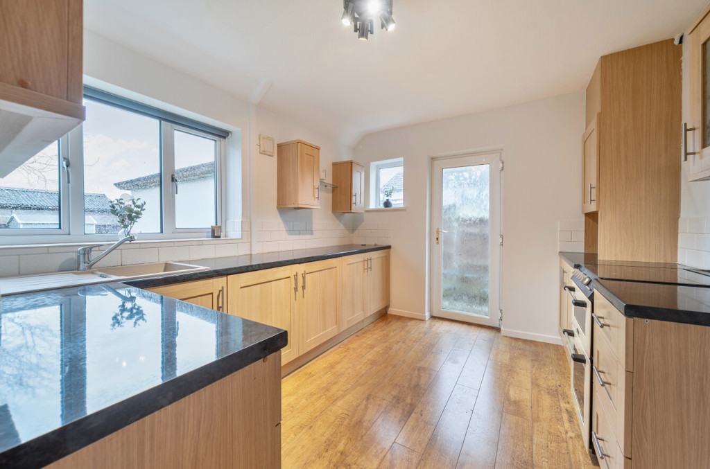 The kitchen includes both low level and high level units, tiling to splashback areas, composite sink with mixer tap, wood effect flooring and a cooker. To the side aspect is a window and to the rear aspect is an obscured glazed door.
