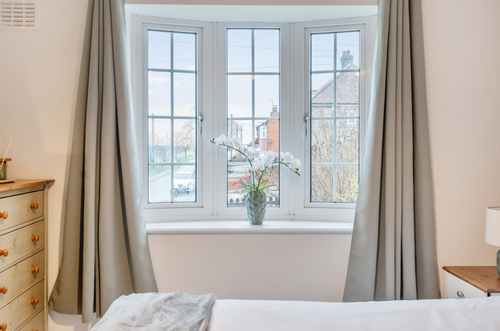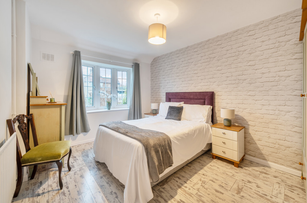 Bedroom one includes wood effect flooring and a bay window to the front aspect.