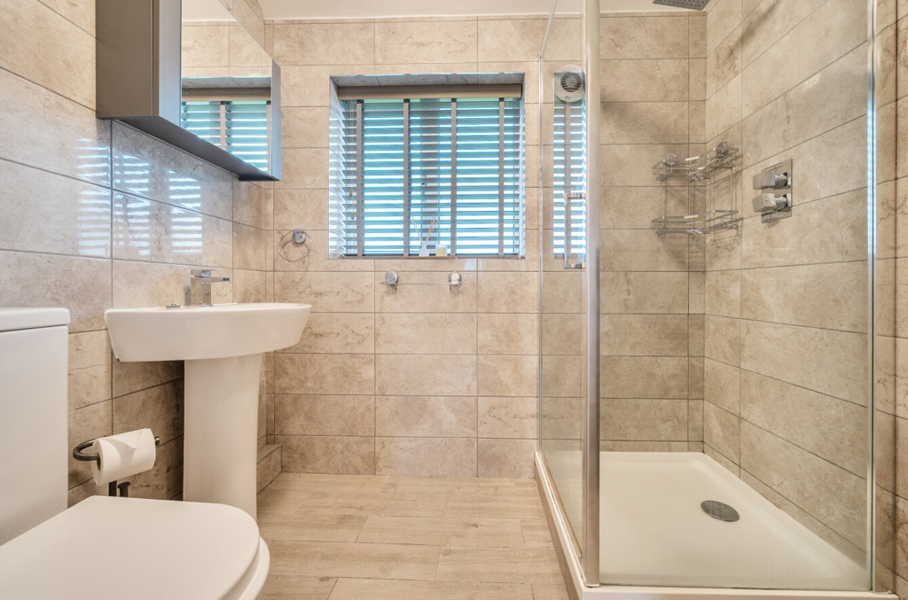 The shower room includes a WC, handwash basin, shower cubicle with rainfall shower head, obscured window with fitted blind, chrome towel radiator and an extractor fan.