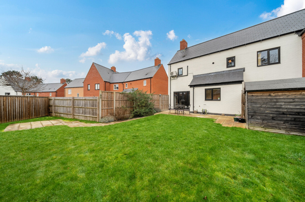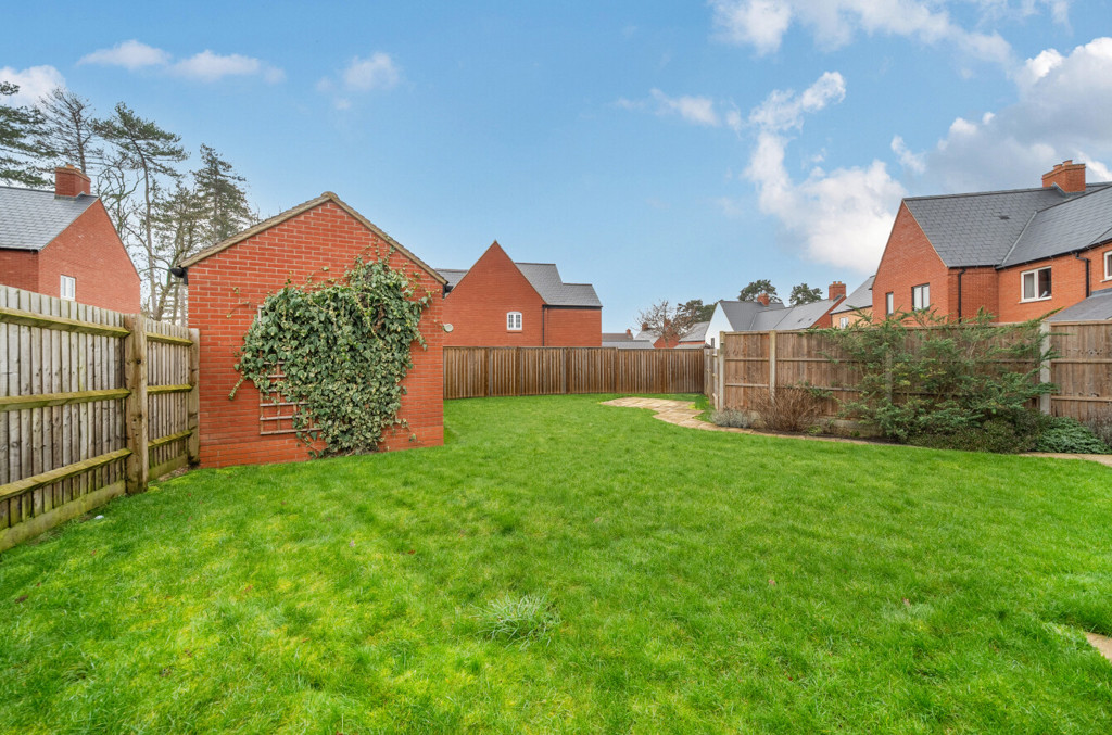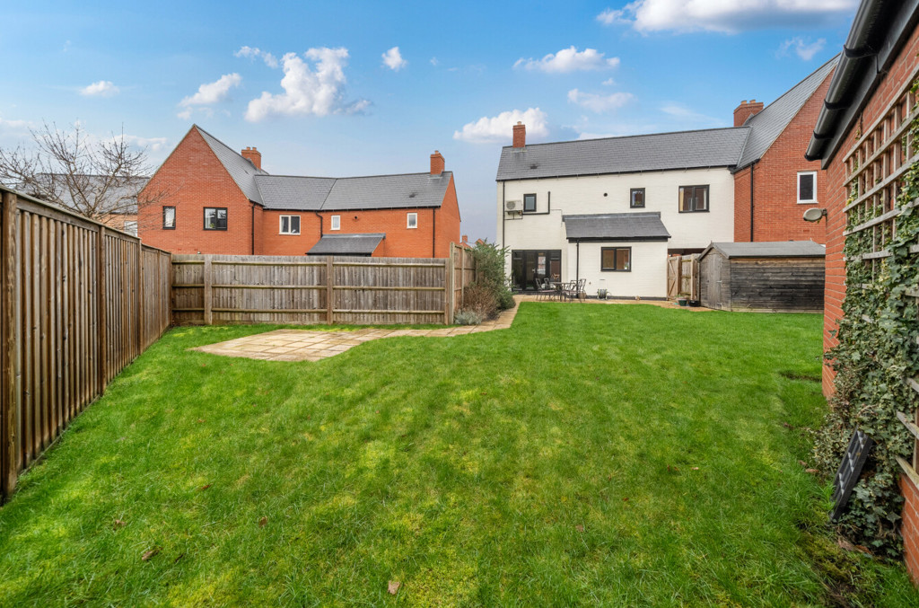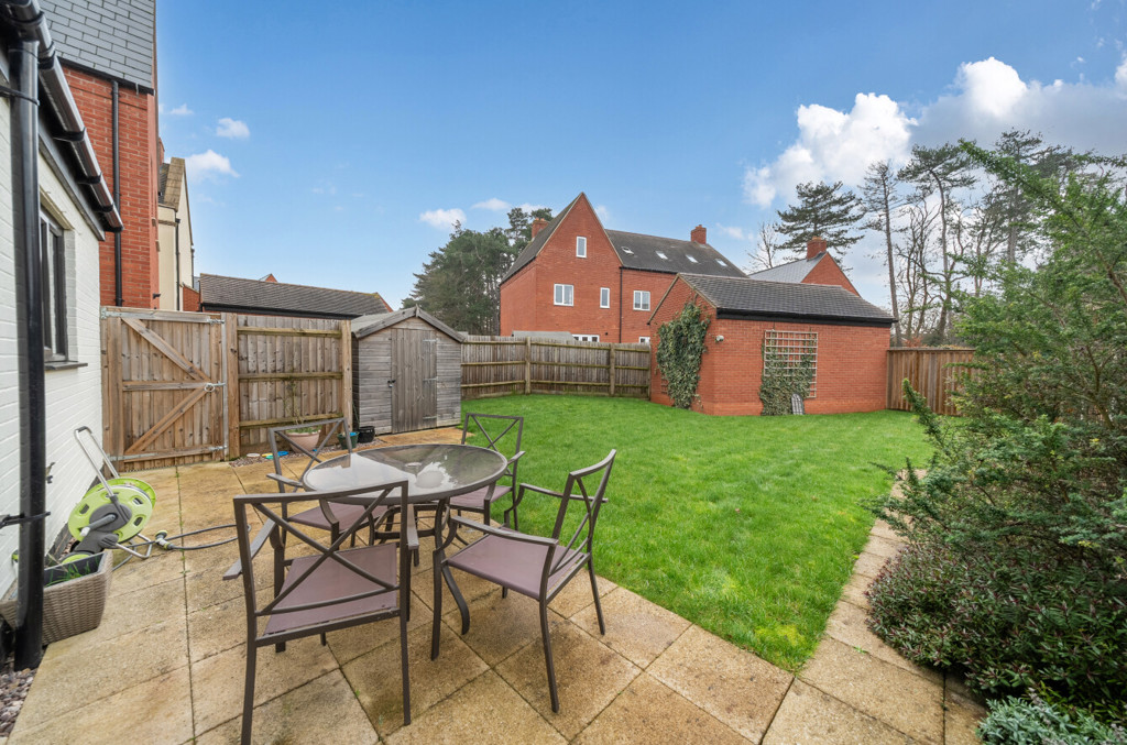 The garden is fully enclosed by timber fencing and has been mainly laid to lawn. It also includes areas laid to patio for seating, slabbed footpath, space for a shed and a wooden gate which provides access to the driveway. There are also some plants and shrubs to the borders.
