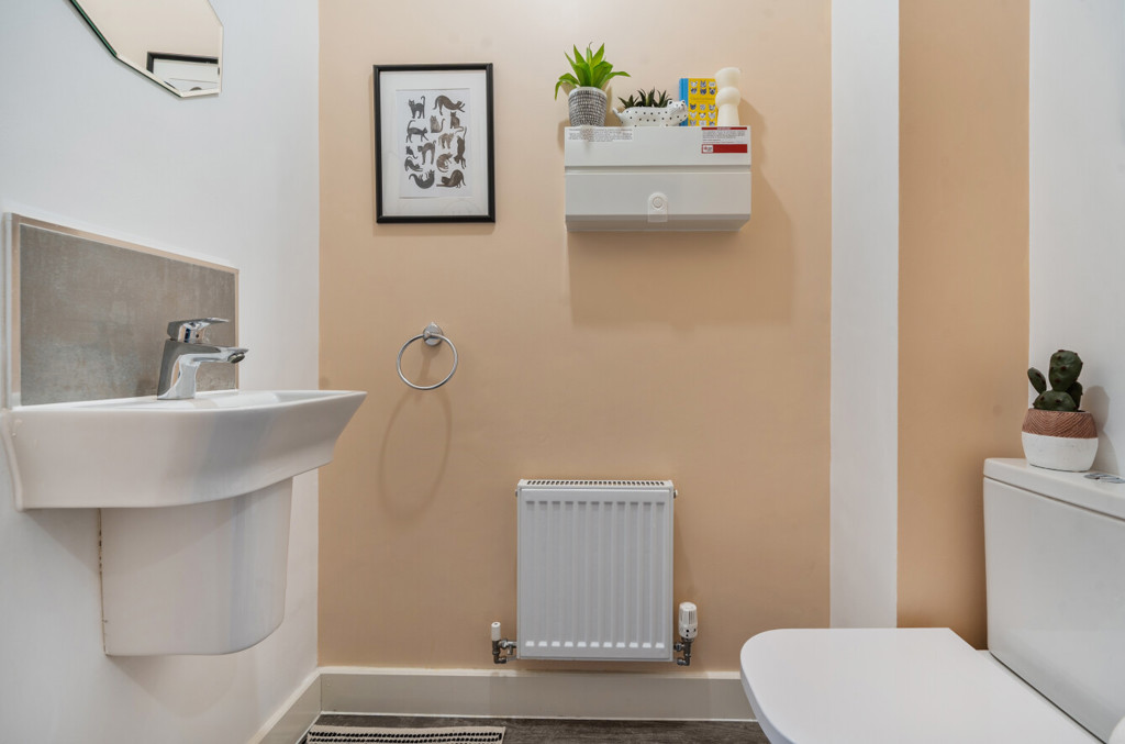 The cloakroom includes a WC, handwash basin, splashback tiling and an extractor fan.